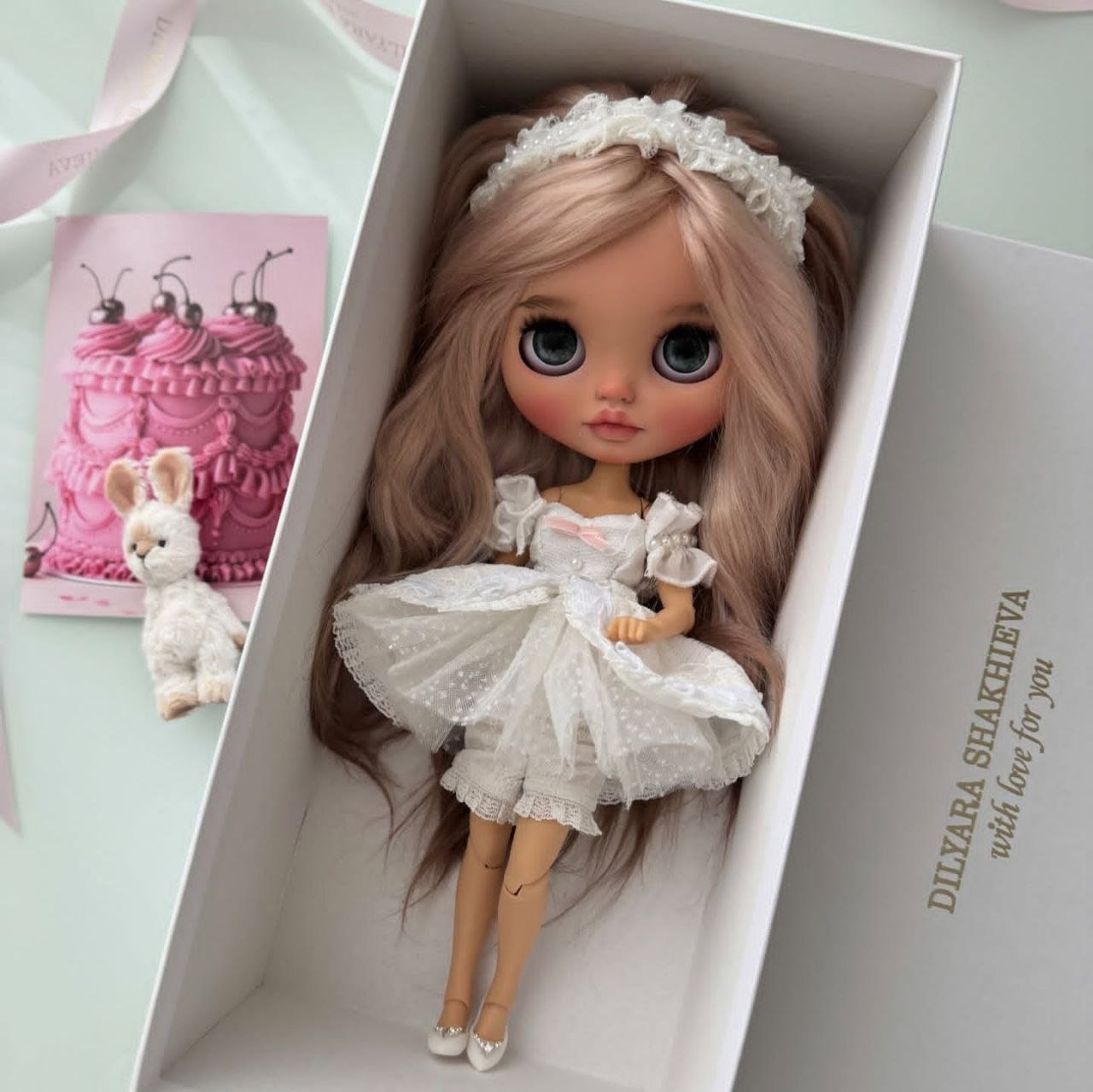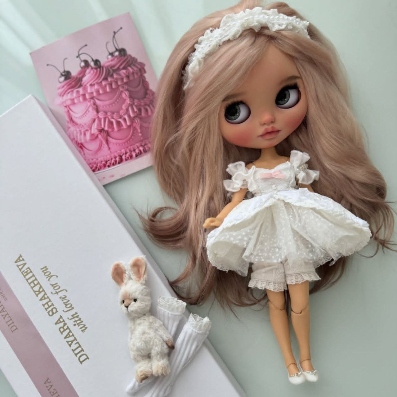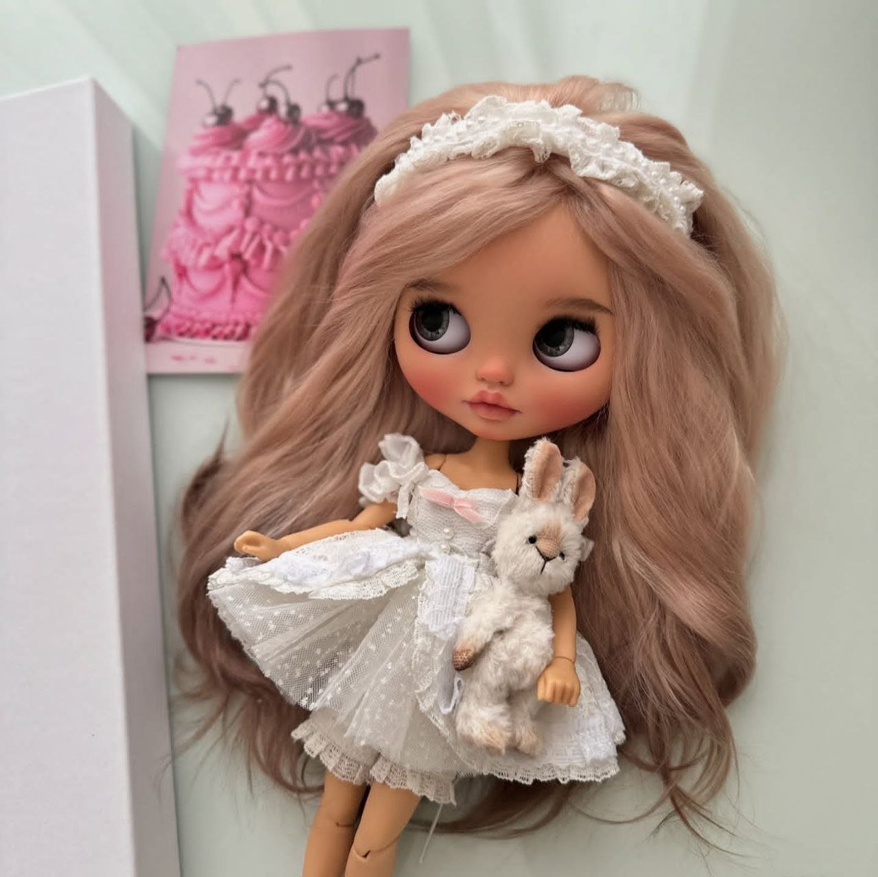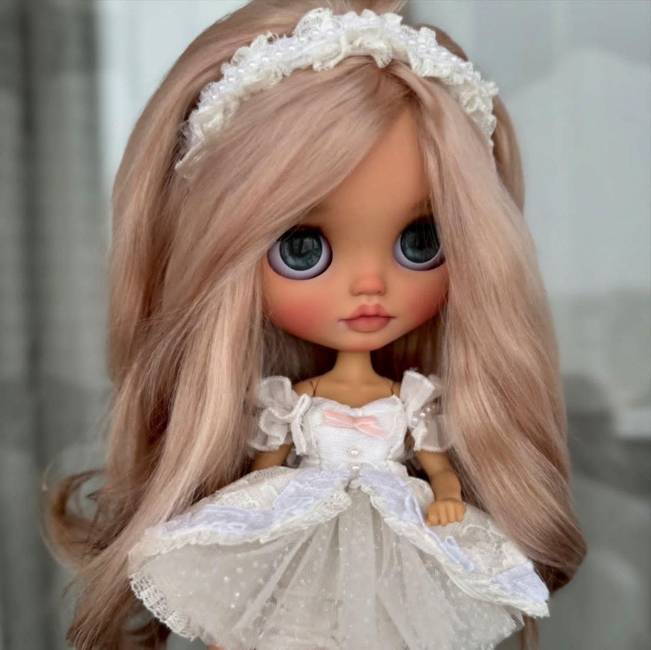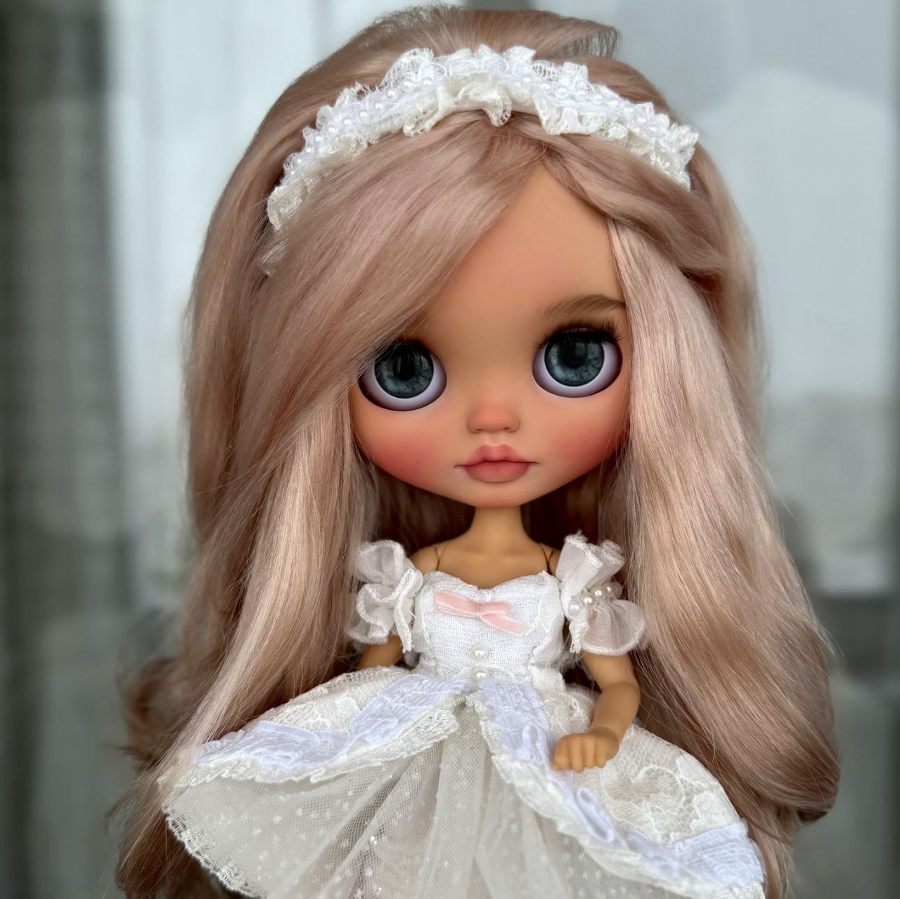 She is customized from a TBL/fake Blythe in the tan skin tone, with the standard fake Azone articulated body. She has a full, beautiful factory scalp in peachy blond waves. Please keep in mind that while the face matches the body, the skin tone on the scalp is naturally slightly lighter in tone. Please also note that her eyes arenβt 100% symmetrical since they are hand sculpted and carved.