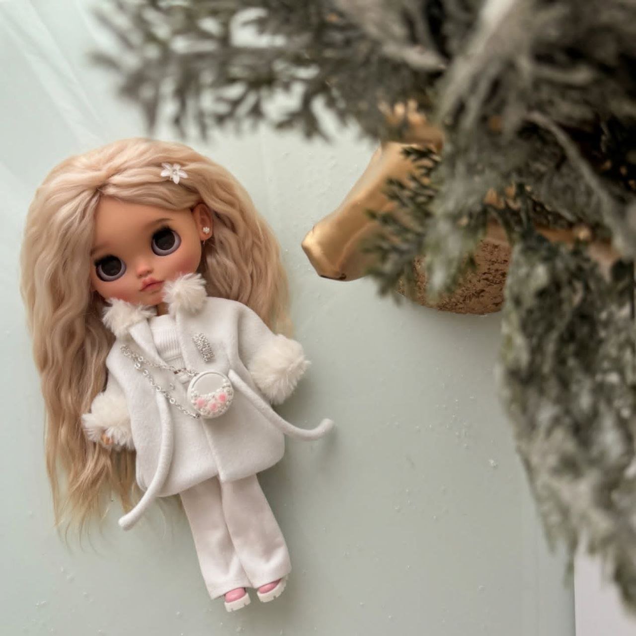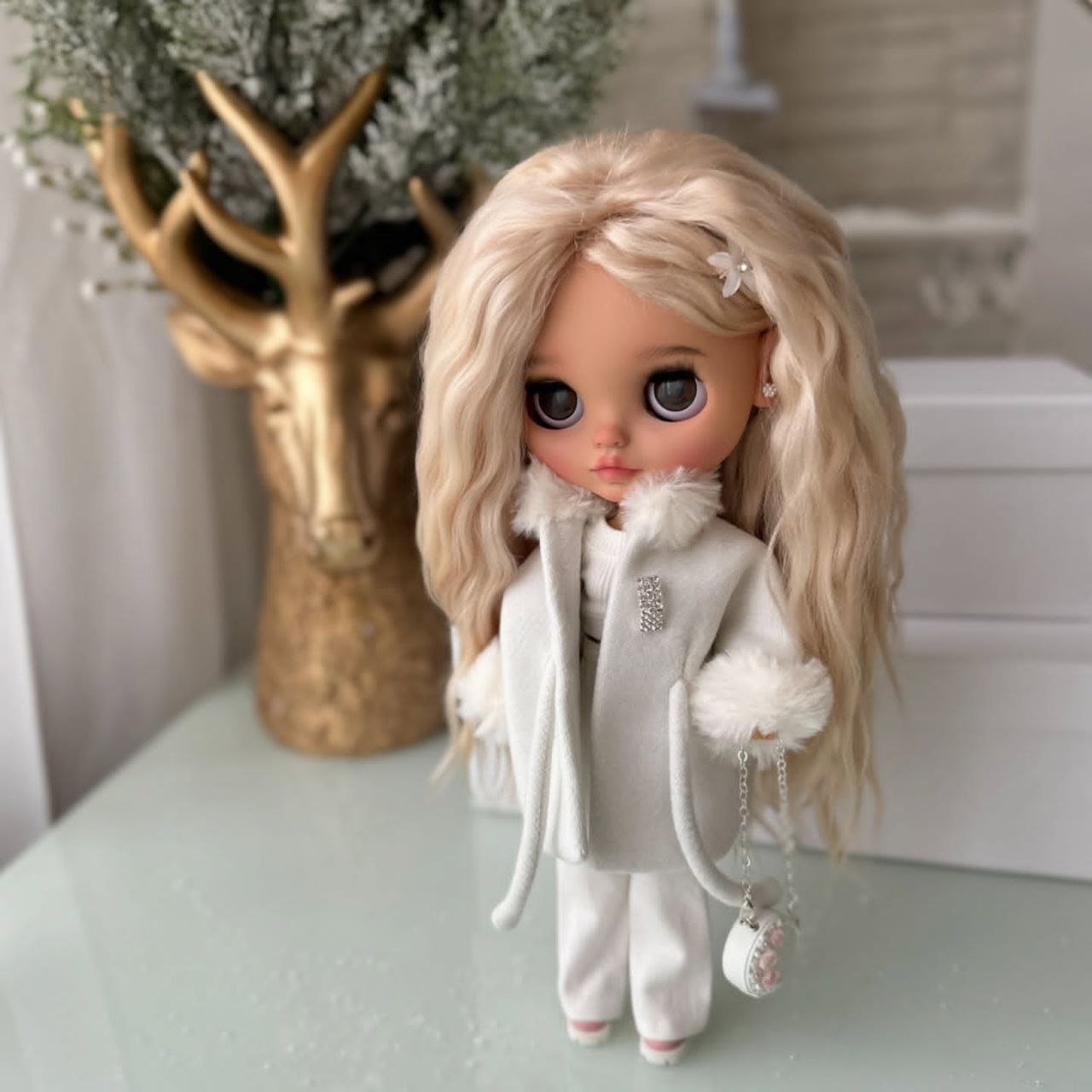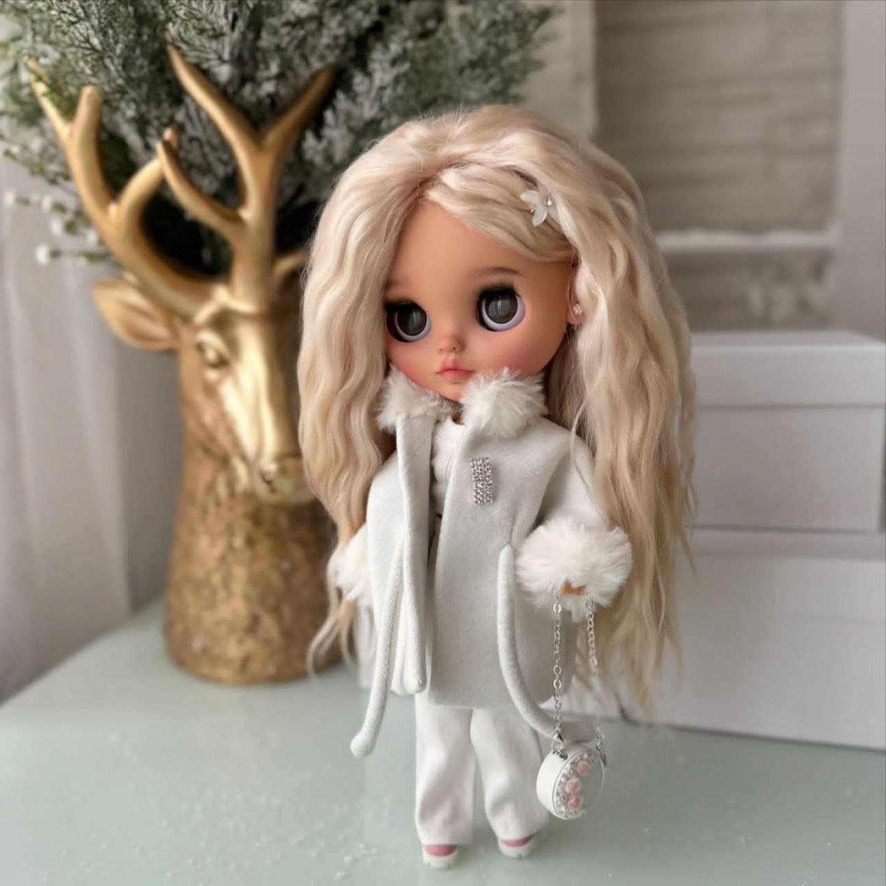 This custom Blythe doll exudes an air of “winter luxury” with her striking monochromatic aesthetic. Her voluminous, wavy platinum blonde hair beautifully frames a delicate “face-up” that features soft peach tones and incredibly expressive, oversized grey eyes.