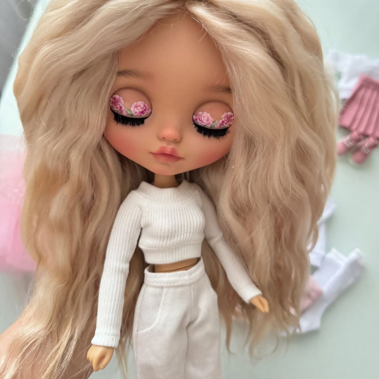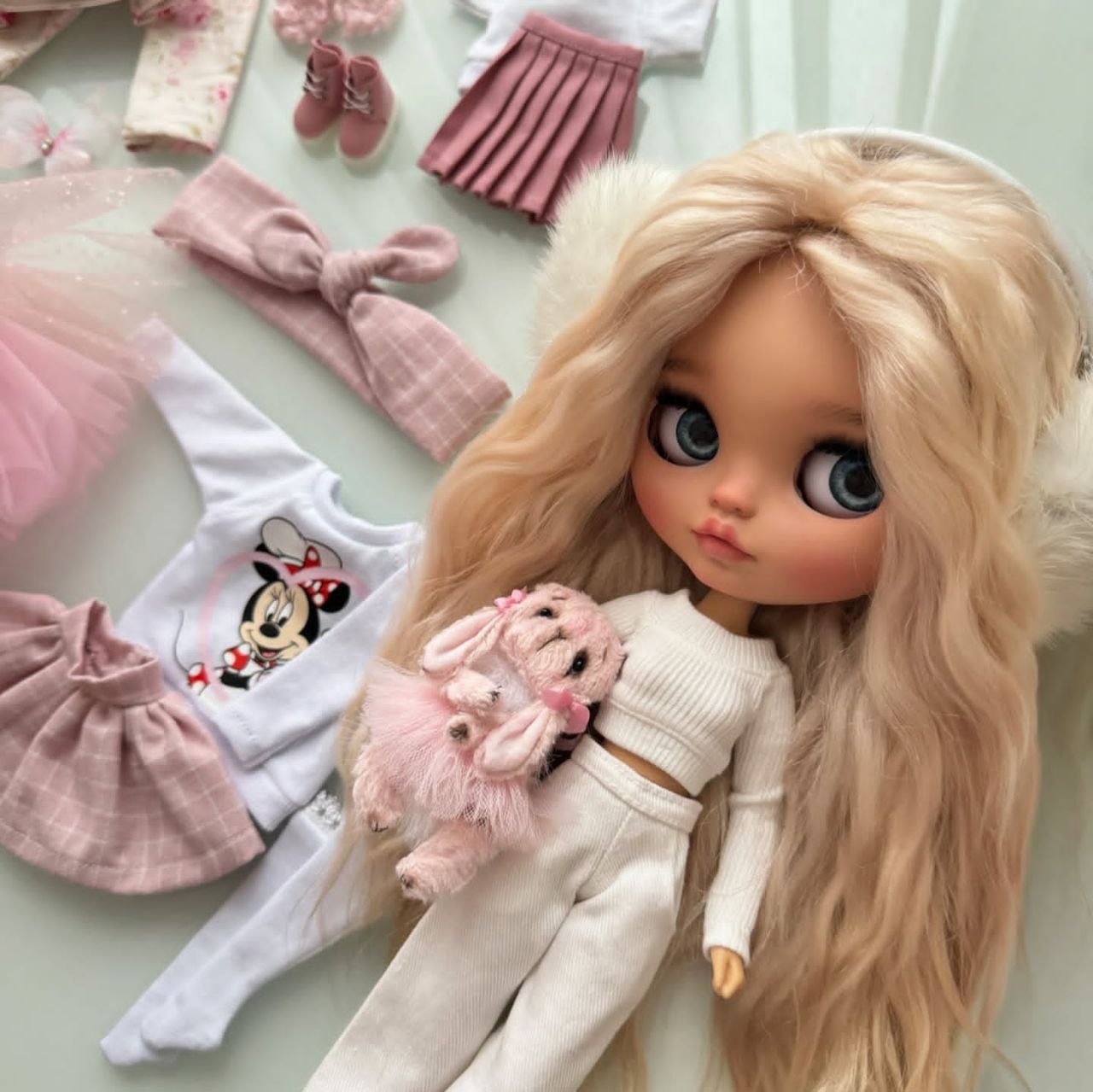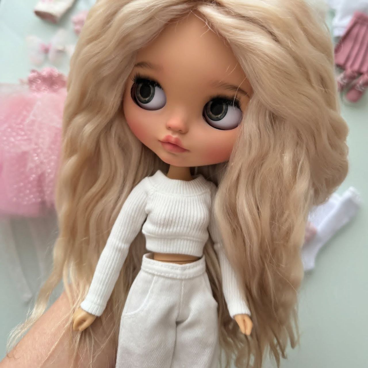 This custom Blythe doll exudes an air of “winter luxury” with her striking monochromatic aesthetic. Her voluminous, wavy platinum blonde hair beautifully frames a delicate “face-up” that features soft peach tones and incredibly expressive, oversized grey eyes.