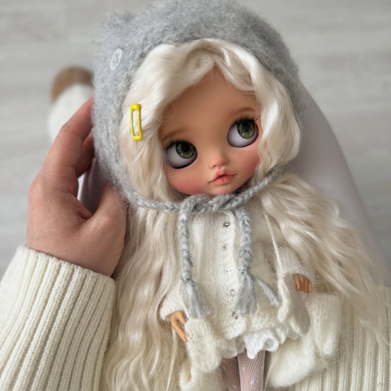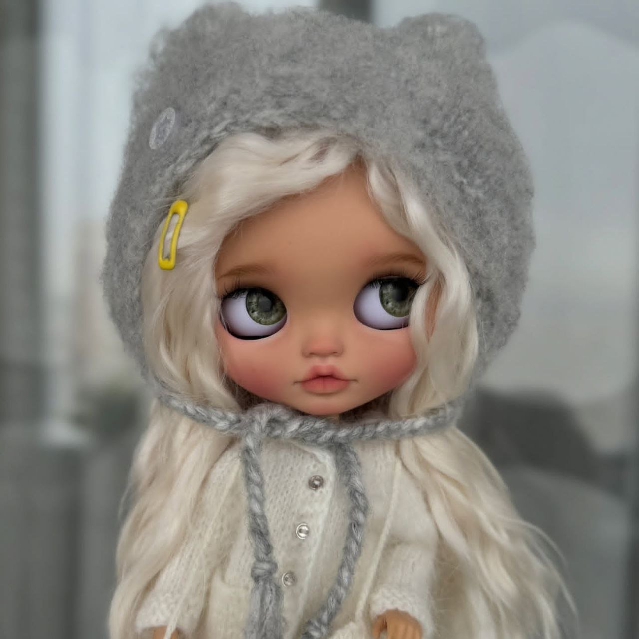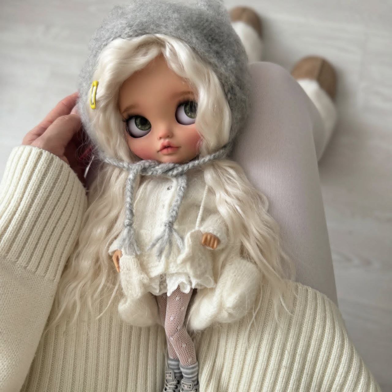 She’s a beautifully styled Blythe doll featuring long, silky platinum hair and soft, expressive eyes that give her a gentle, dreamy look. She is dressed in a cozy cream knit outfit with delicate details and a charming grey hat, creating a warm and timeless aesthetic. A perfect addition for collectors who appreciate elegance, charm, and handcrafted beauty. ✨