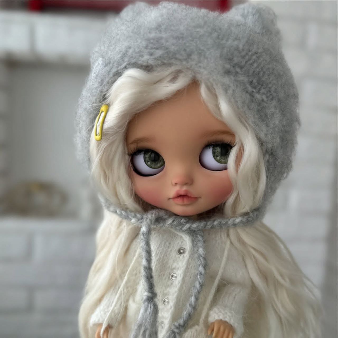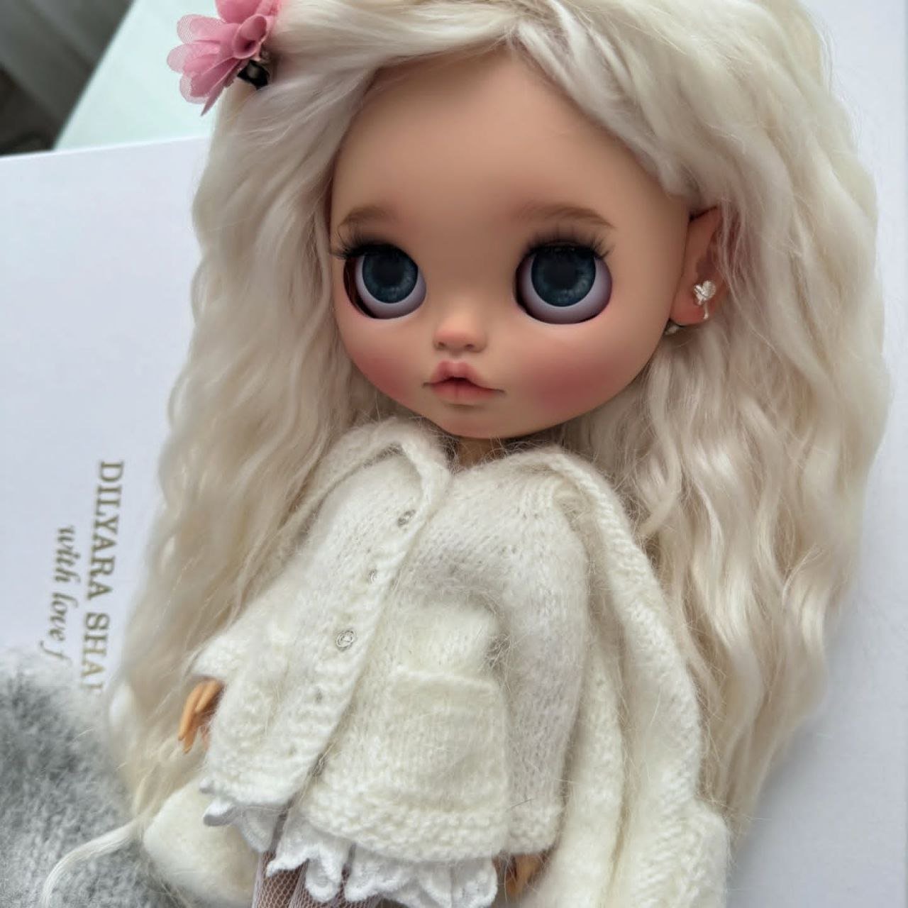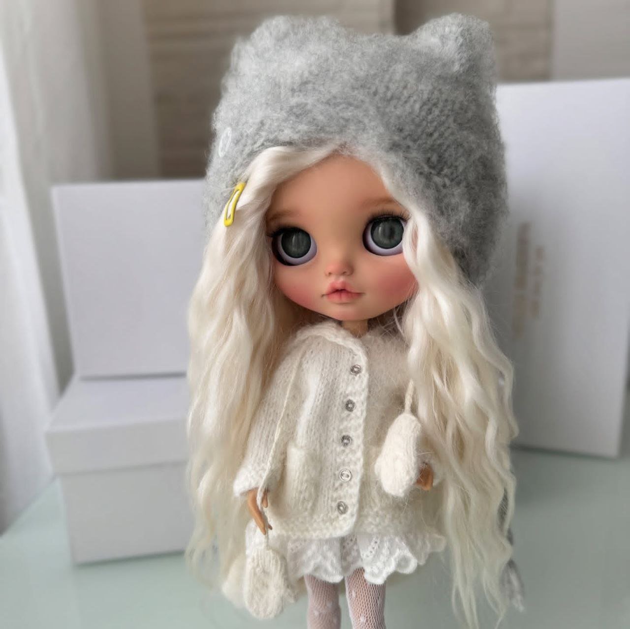 She’s a beautifully styled Blythe doll featuring long, silky platinum hair and soft, expressive eyes that give her a gentle, dreamy look. She is dressed in a cozy cream knit outfit with delicate details and a charming grey hat, creating a warm and timeless aesthetic. A perfect addition for collectors who appreciate elegance, charm, and handcrafted beauty. ✨