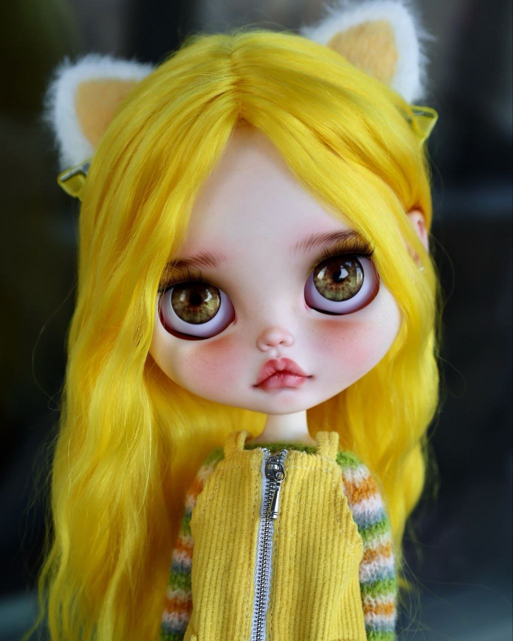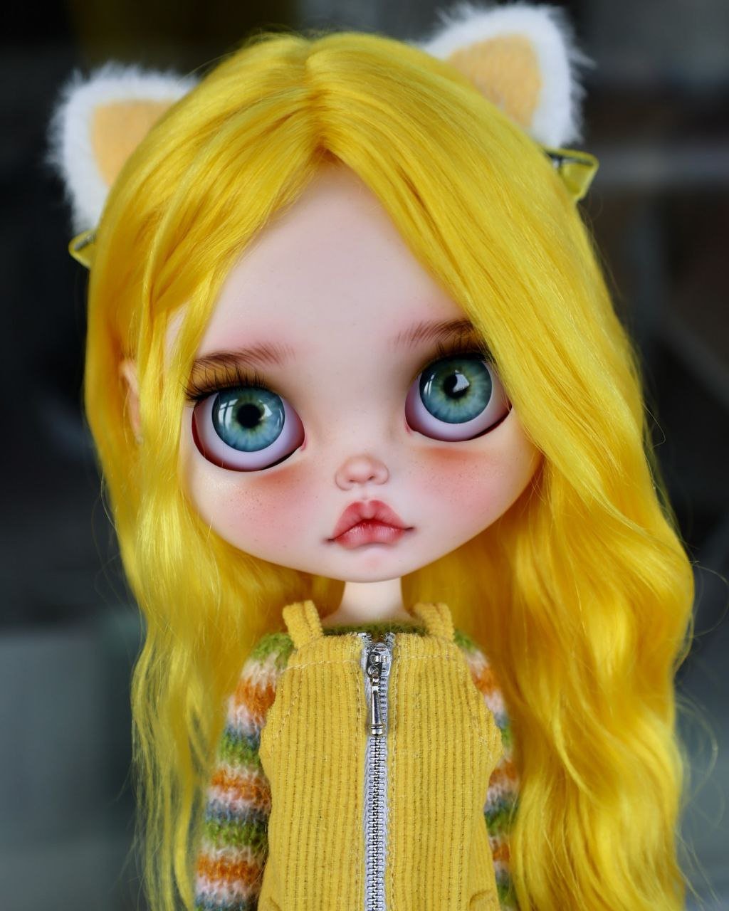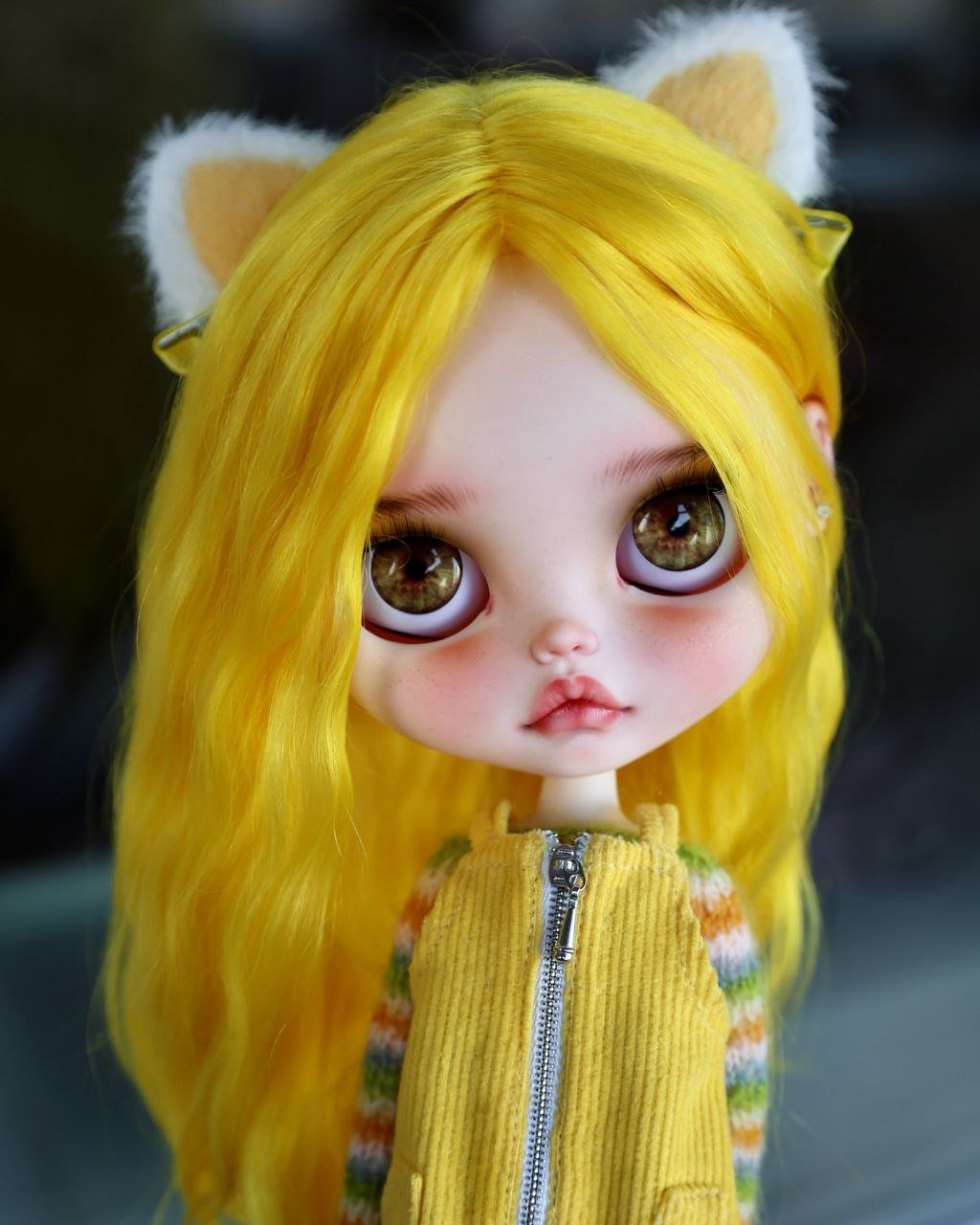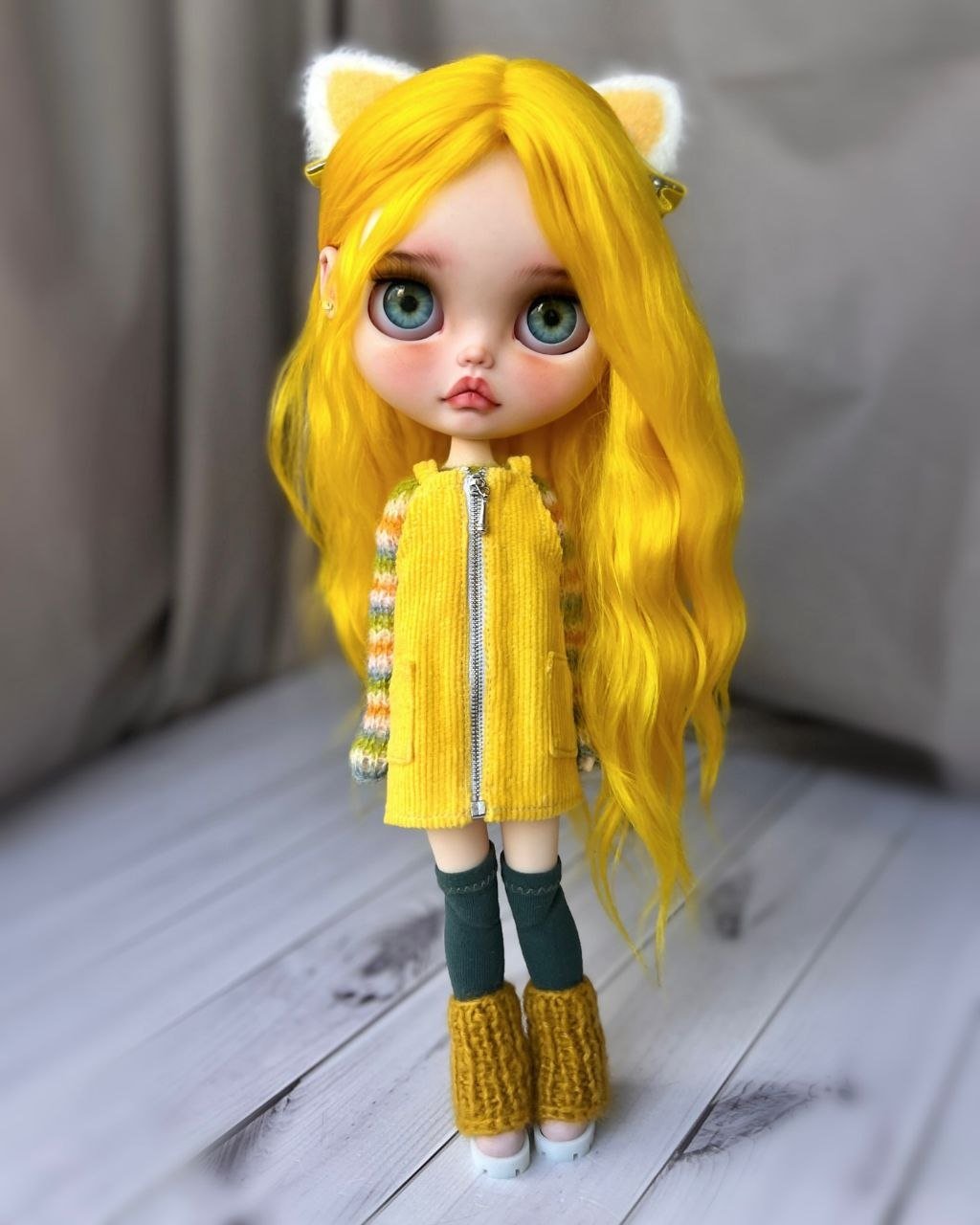Introducing our vibrant new muse: Sunshine & Retro Haze. This custom Blythe is a saturation boost for the soul, drawing inspiration from retro 70s fashion and playful textures. With her eye-catching, wavy lemon-yellow hair and adorable cat-ear accessories, she’s all about fun. The outfit is a mix of nostalgia: a textured yellow corduroy jumper featuring a bold zipper, layered over a colorful, multi-stripe knit sweater. Grounded by cozy forest-green knee socks and gold knit ankle warmers, this look is a sun-drenched throwback perfect for any eclectic collection.