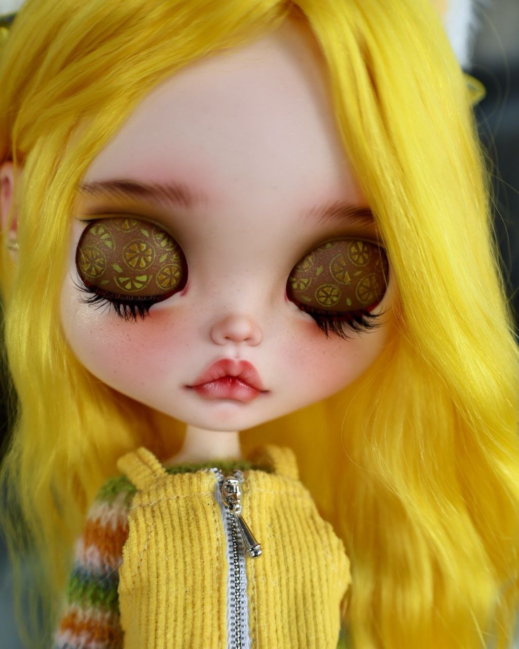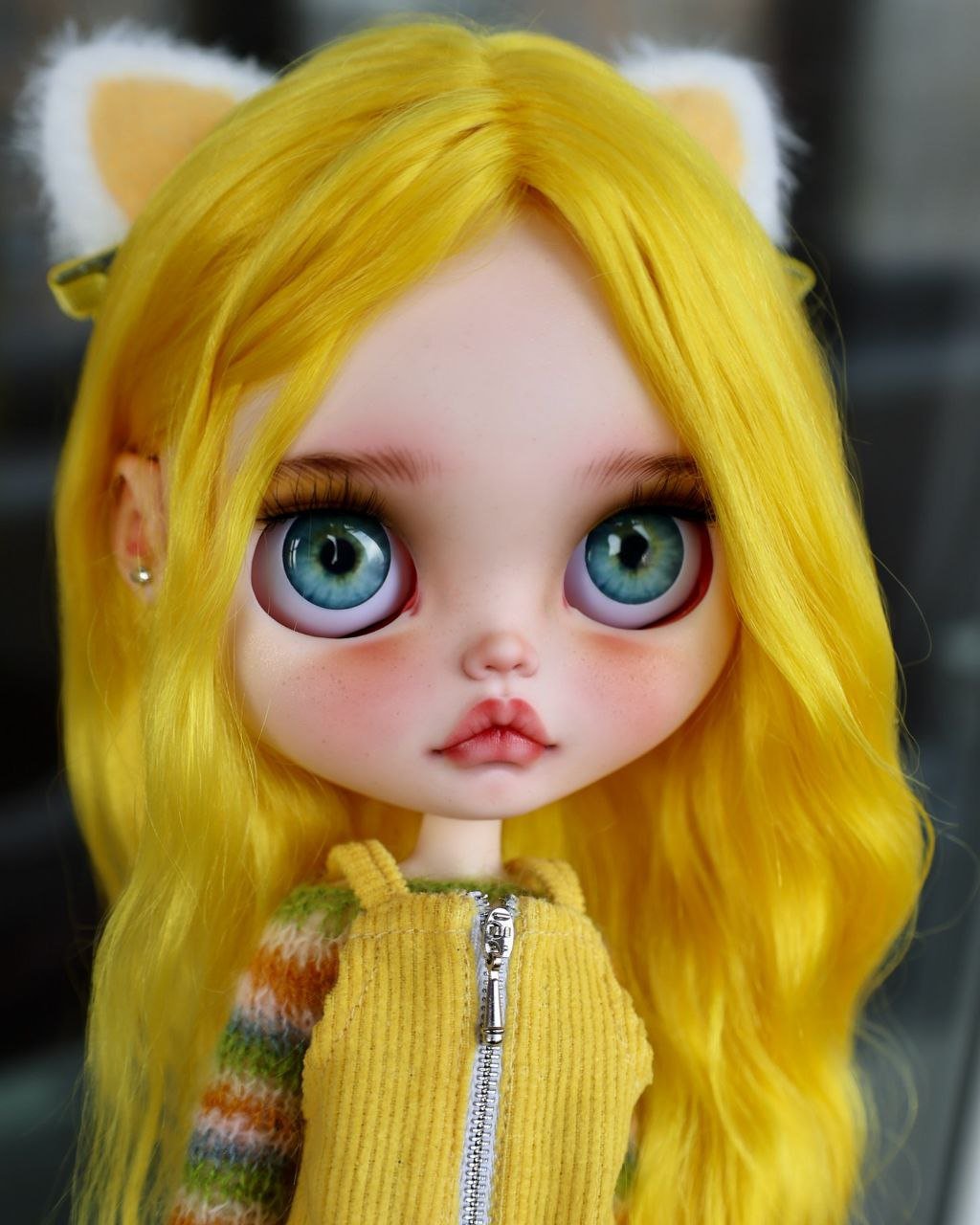 Meet LUX, my 59th custom doll! Introducing our vibrant new muse: Sunshine & Retro Haze. This custom Blythe is a saturation boost for the soul, drawing inspiration from retro 70s fashion and playful textures. With her eye-catching, wavy lemon-yellow hair and adorable cat-ear accessories, she’s all about fun.