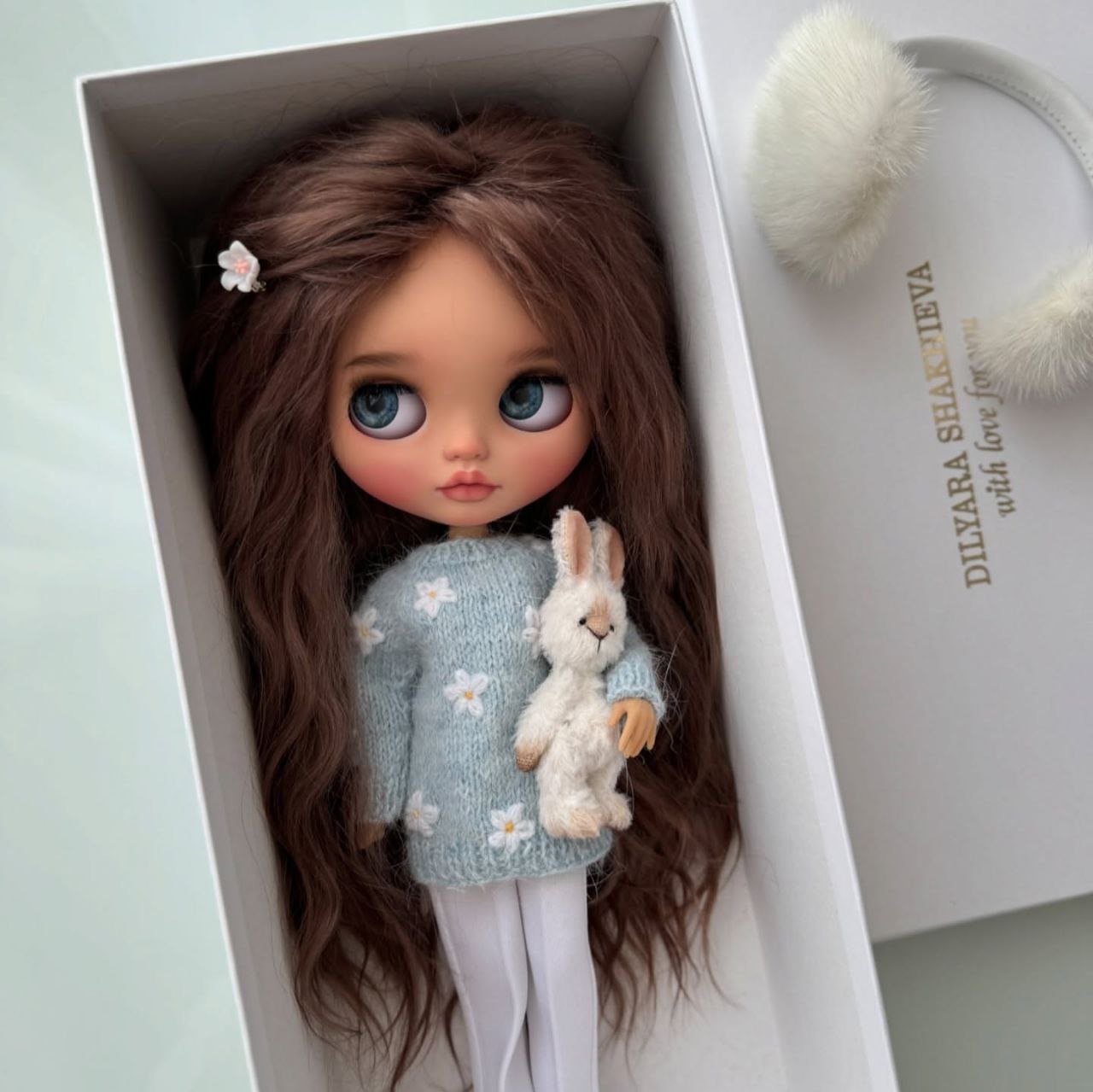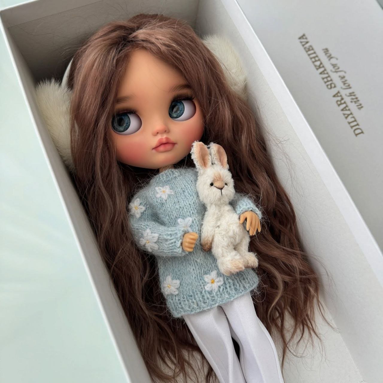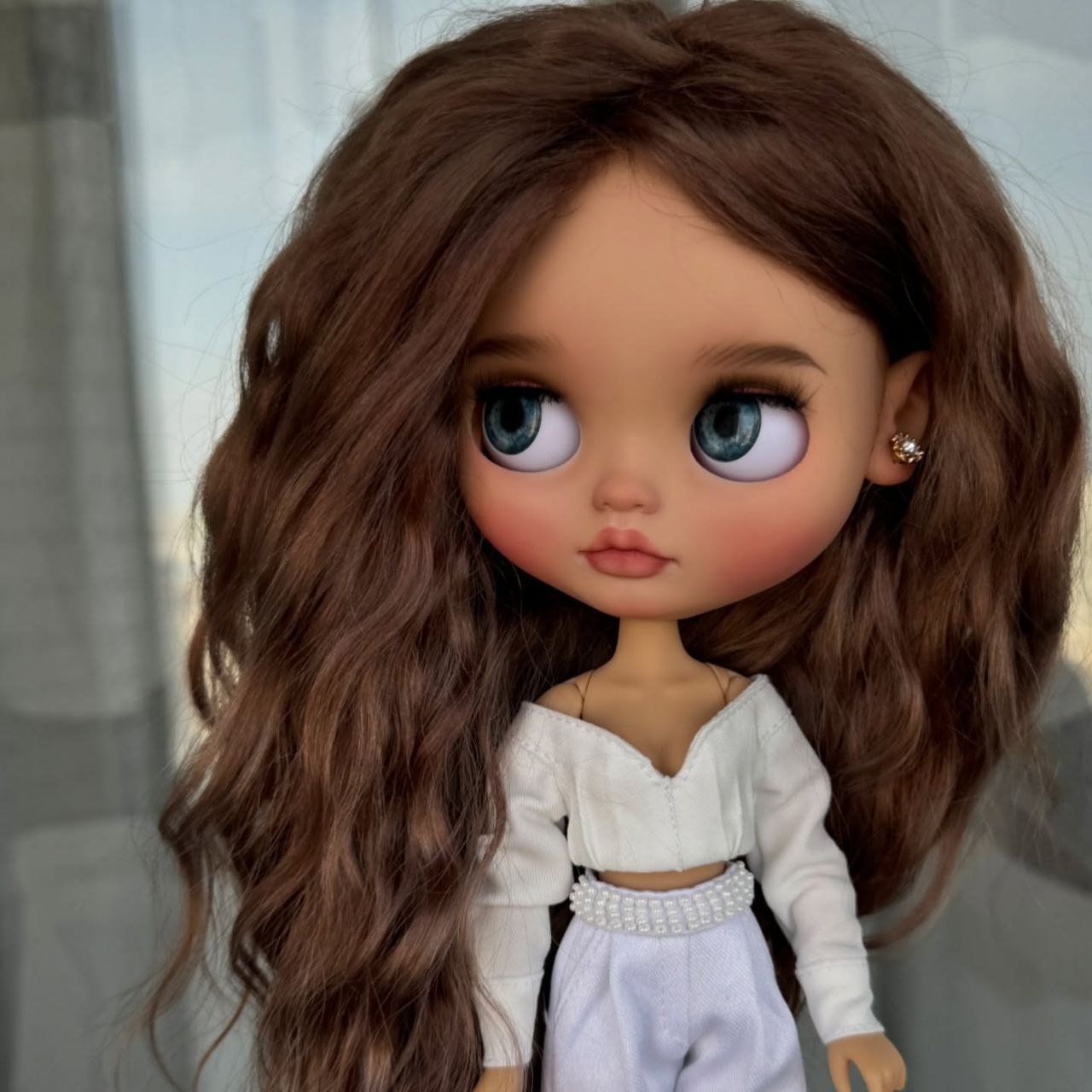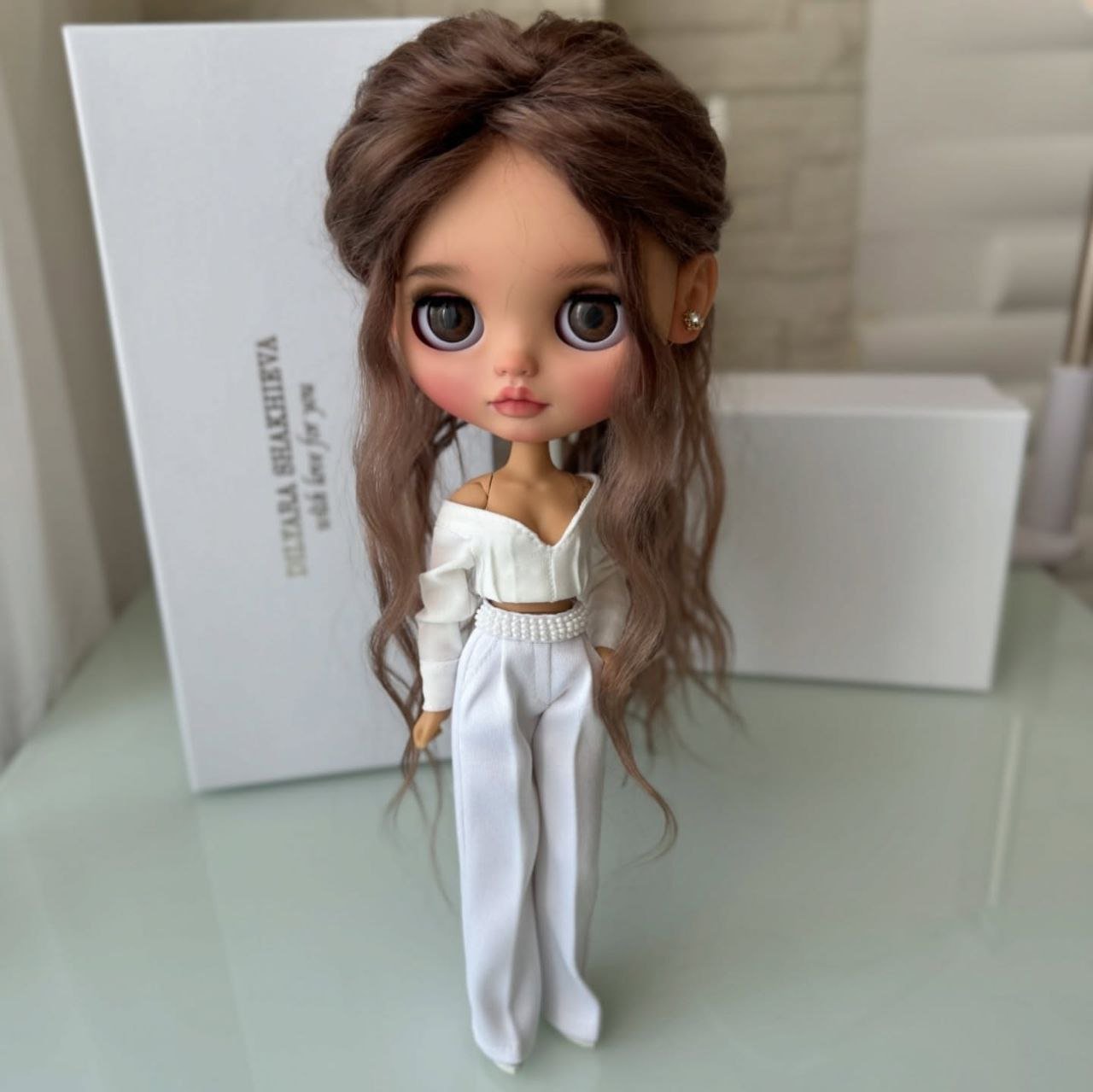 This custom Blythe doll exudes an air of “winter luxury” with her striking monochromatic aesthetic. Her voluminous, wavy platinum blonde hair beautifully frames a delicate “face-up” that features soft peach tones and incredibly expressive, oversized grey eyes.