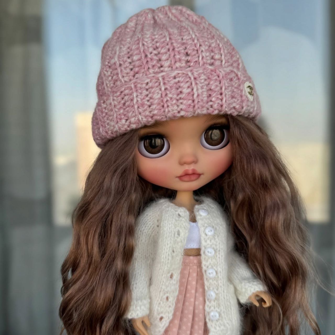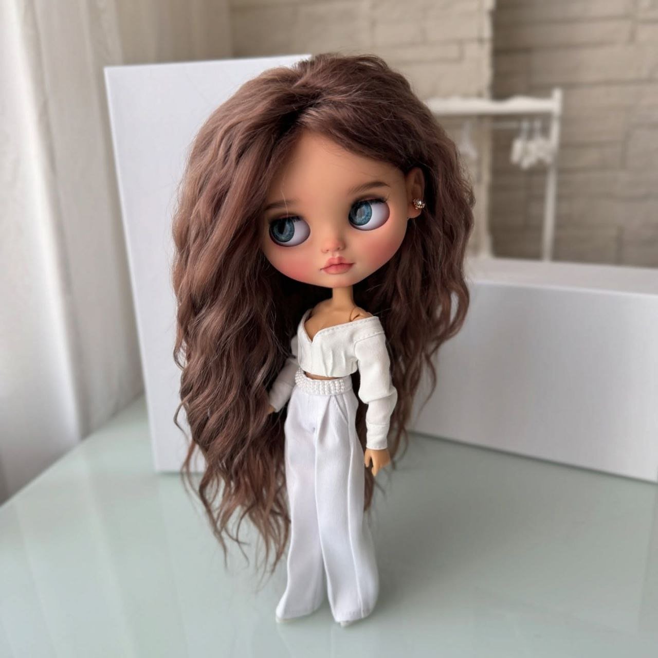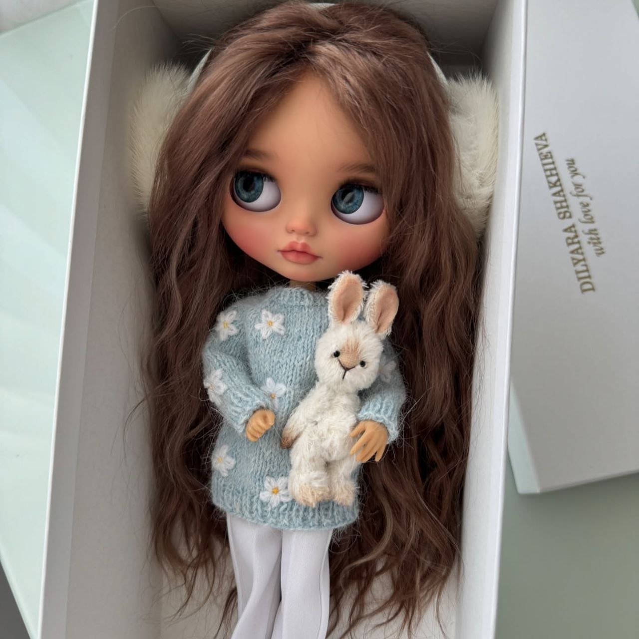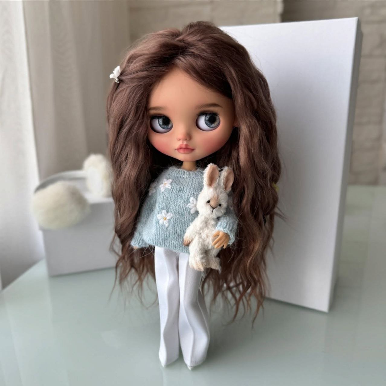 This custom Blythe doll exudes an air of “winter luxury” with her striking monochromatic aesthetic. Her voluminous, wavy platinum blonde hair beautifully frames a delicate “face-up” that features soft peach tones and incredibly expressive, oversized grey eyes.
