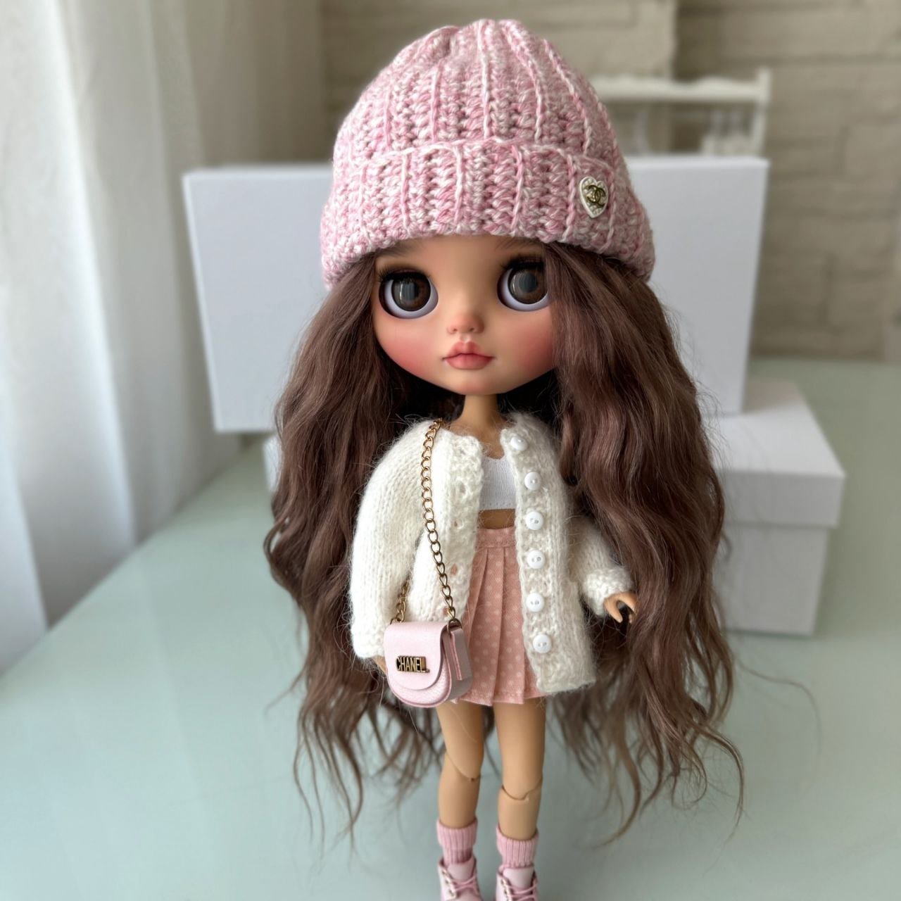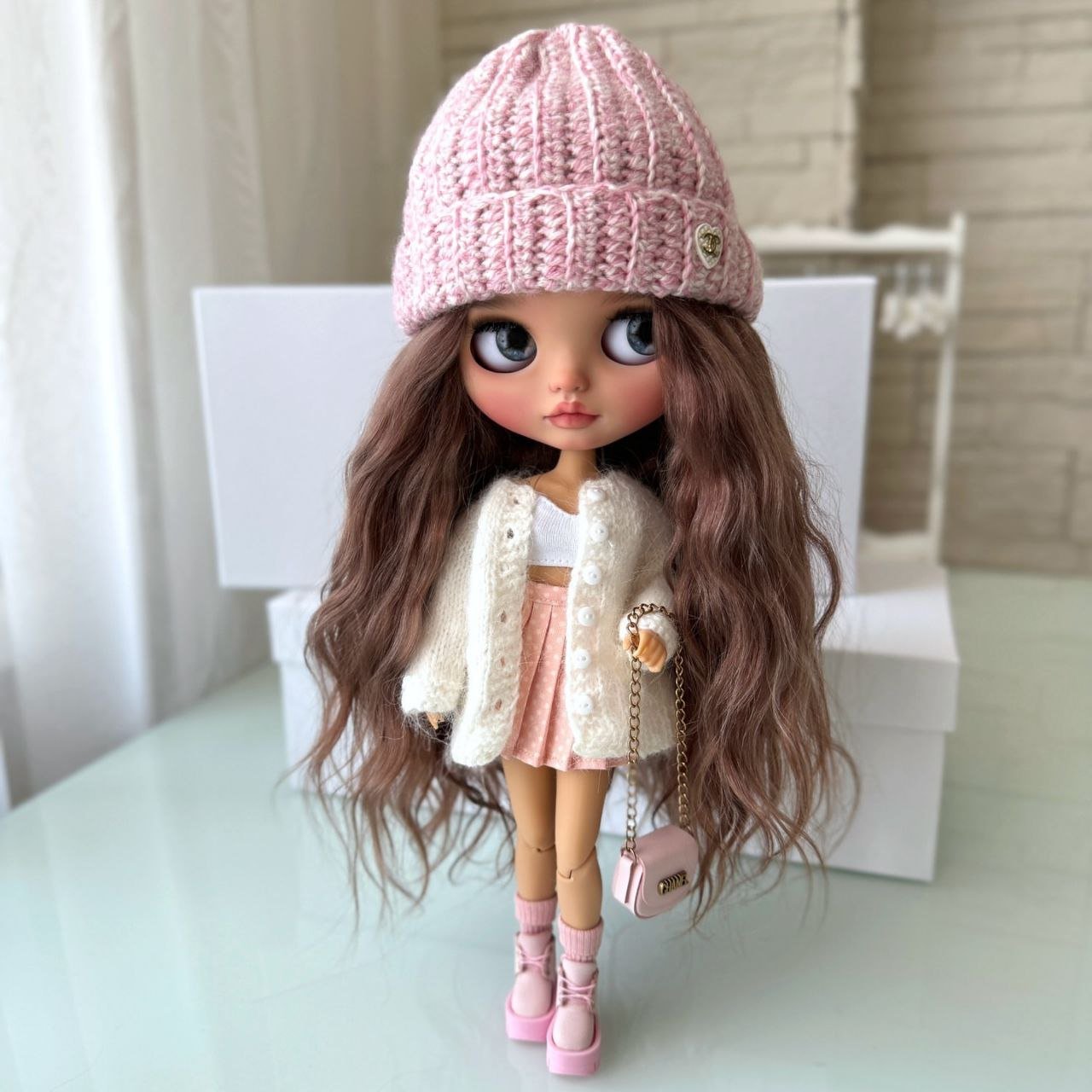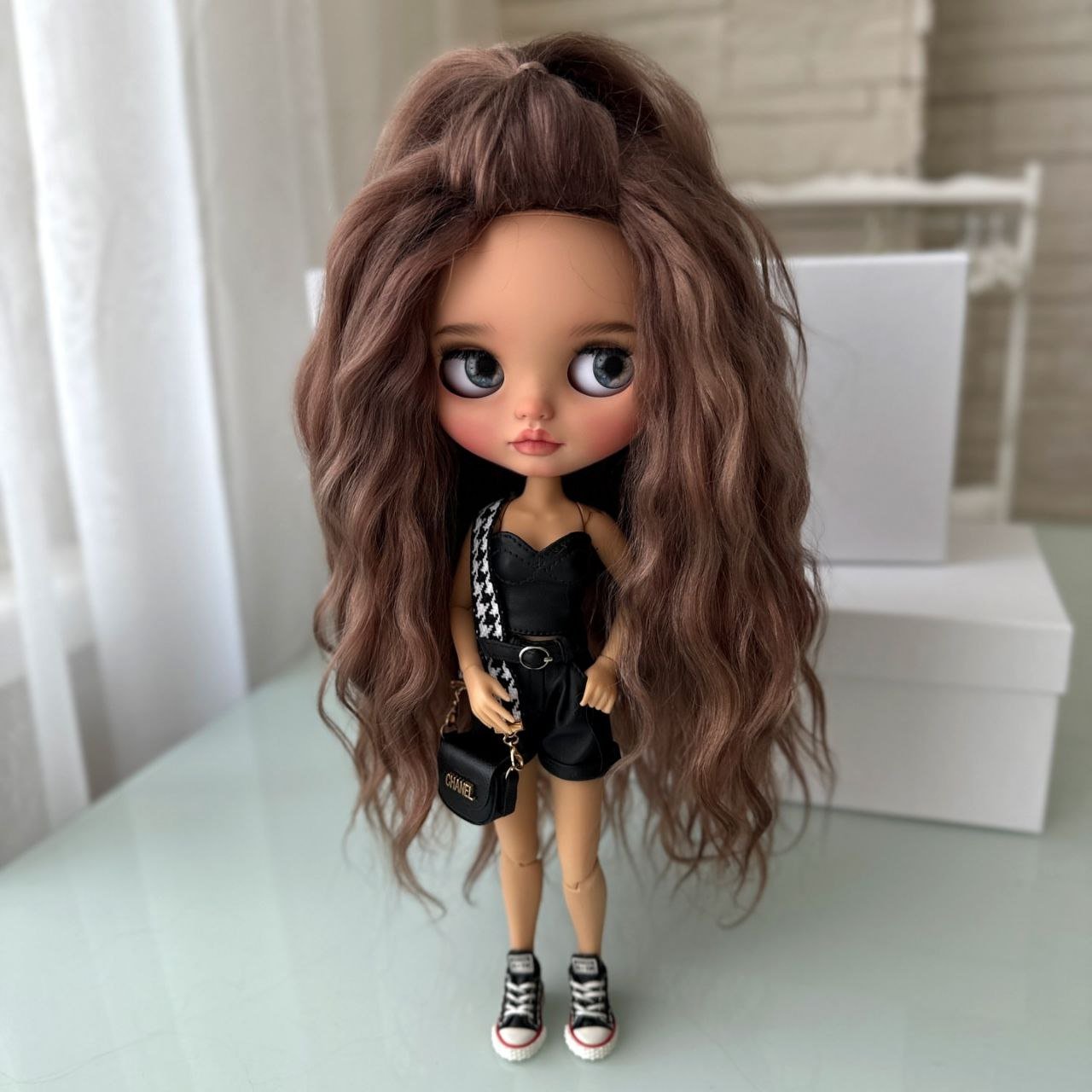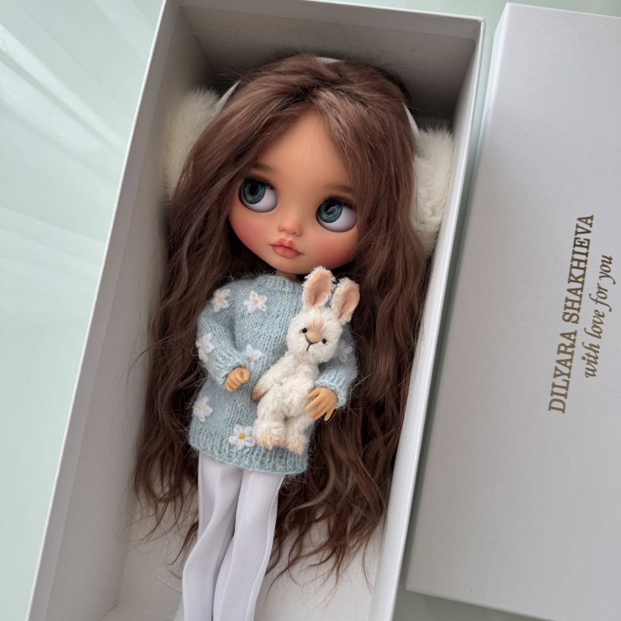 This custom Blythe doll exudes an air of “winter luxury” with her striking monochromatic aesthetic. Her voluminous, wavy platinum blonde hair beautifully frames a delicate “face-up” that features soft peach tones and incredibly expressive, oversized grey eyes.