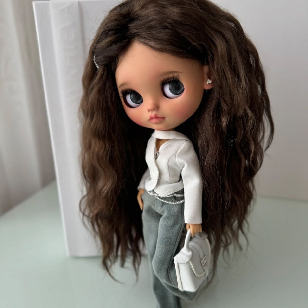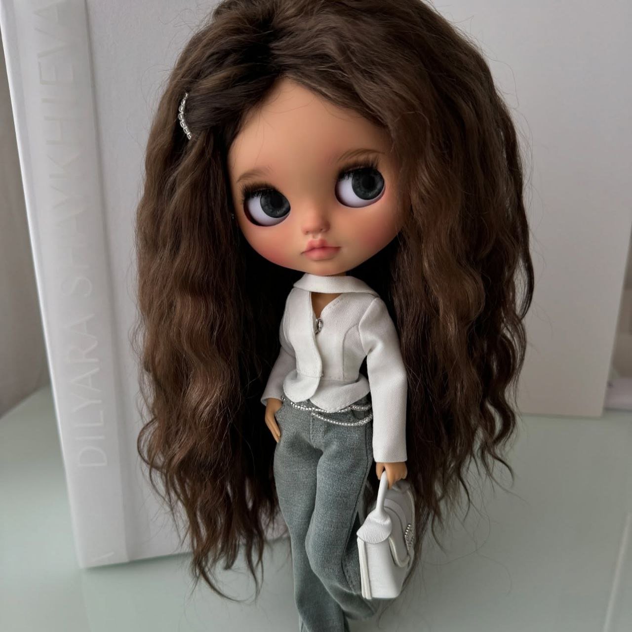 Hair & Texture: She boasts voluminous, floor-length waves in a rich espresso shade. The hair provides a beautiful, organic contrast to the sharp, clean lines of her professional attire.